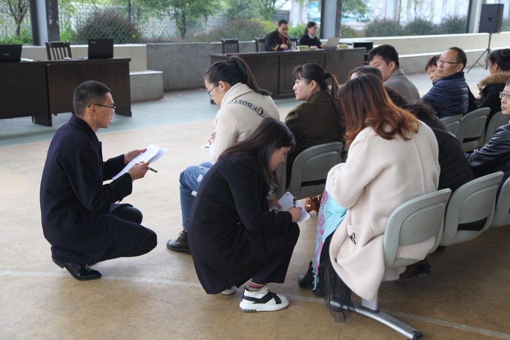 在庭前会议现场,上百名当事人有序的坐在篮球场内,由6名法官助理依次核对当事人身份信息,3名法警在场内维持现场秩序。
