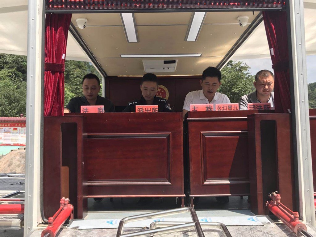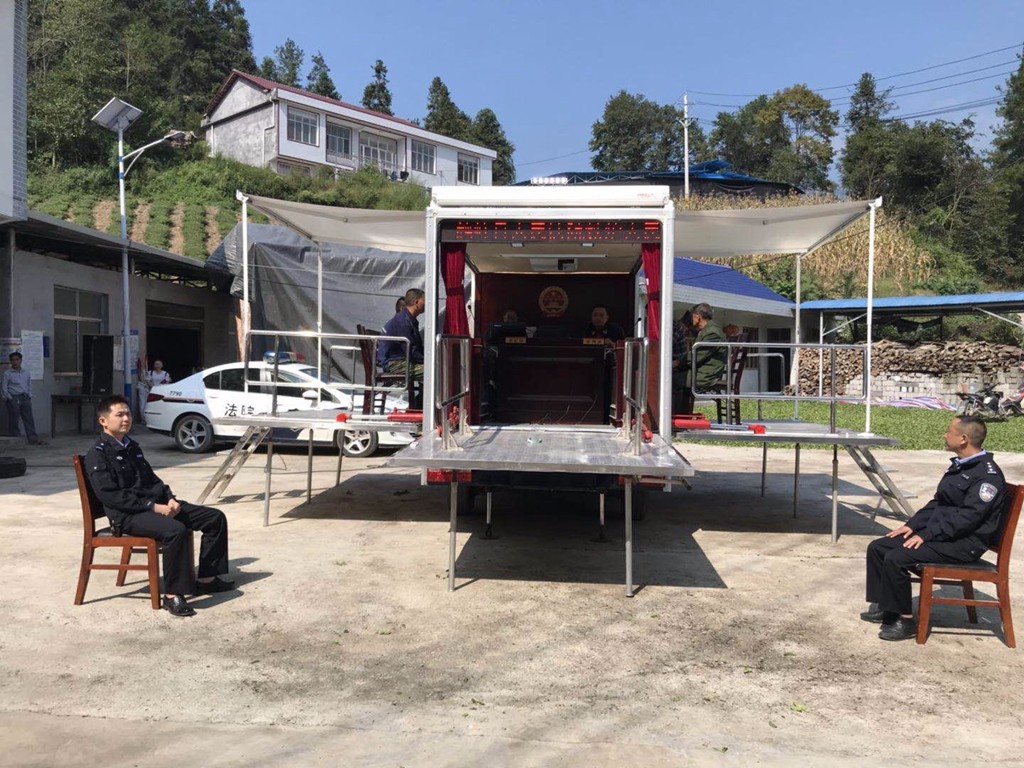 当天上午,村委会门前的小广场上由一辆巡回审判车临时搭起了简易的科技法庭,作为法庭的载体,货车车厢虽不大,可谓麻雀虽小五脏俱全,桌、椅、电脑、桌牌、显示屏、国徽、监控、打印机等等一应俱全。现场也引来了不少前来围观的村民。