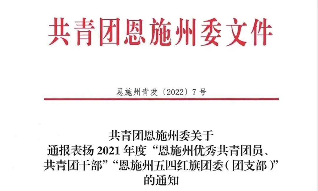 近日,共青团恩施州委对2021年度“恩施州优秀共青团员、共青团干部”“恩施州五四红旗团委(团支部)”进行了通报表扬。其中,我院法官助理米慧彬被评为恩施州优秀共青团员。