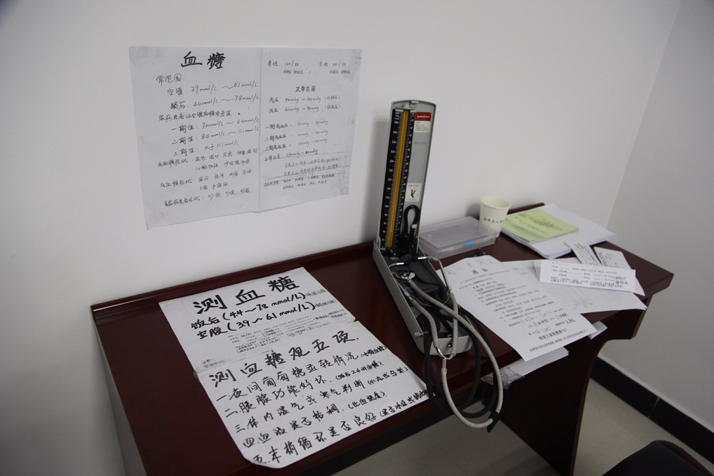 在诊疗室里,中医学院的研究生正在为干警们进行血压测量、颈椎按摩。诊疗室虽小,可谓“五脏俱全”,有理疗设备、血压测量仪、拔罐等,诊疗内容包括:把脉、面诊、舌诊、测血糖、测血压、中医药物熏蒸治疗骨骼类疾病、脏腑类疾病及心脑血管疾病的调理、中医针灸拔罐、足疗等。