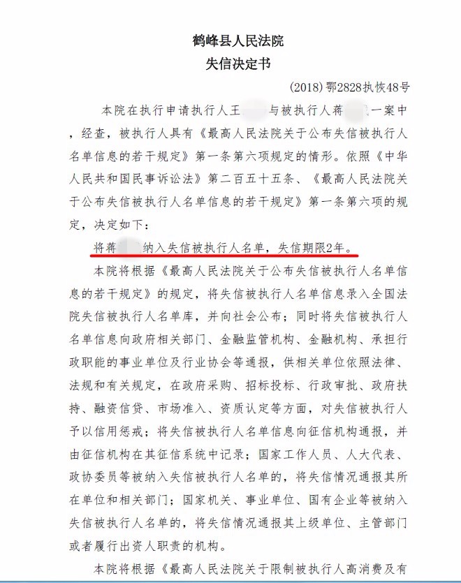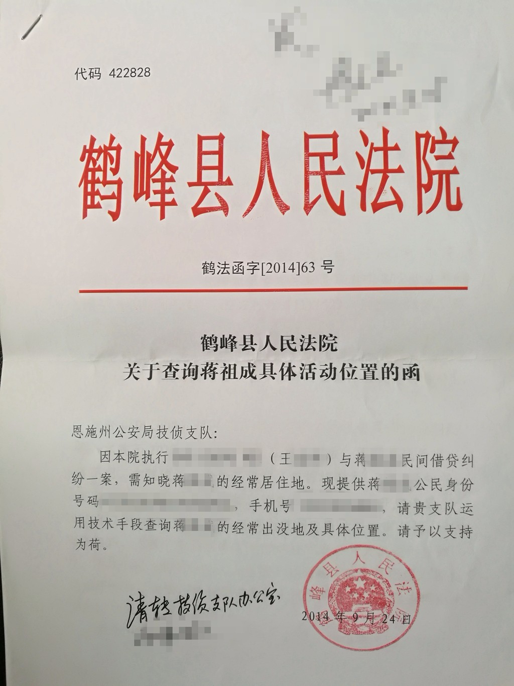 文书生效后,蒋某并未按其履行,王某向鹤峰法院申请强制执行。法院立案受理后,因蒋某去向不明,执行一度陷入僵局,后经多方打听,蒋某在乌鲁木齐开有矿业公司,办案人员于是前往查找线索,可是得到的结果并不乐观,其开设的公司早已人去楼空,属于典型的皮包公司,无任何可供执行的财产,唯一的收获就是查到了蒋某的电话。在执行干警与其联系后,他始终不愿意露面解决此事,长期和办案人员采取拖延战术,一次一次的约期,一次又一次的失信。