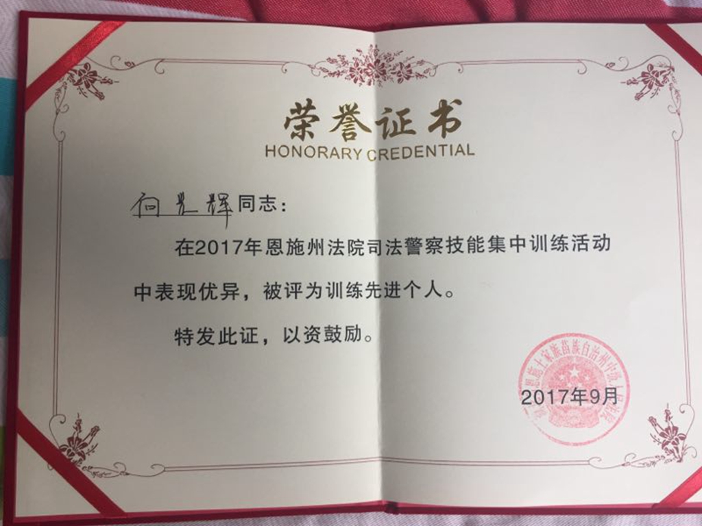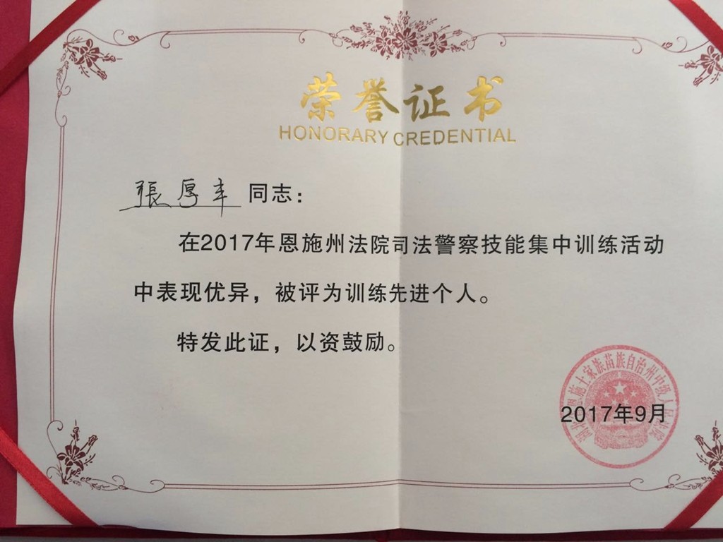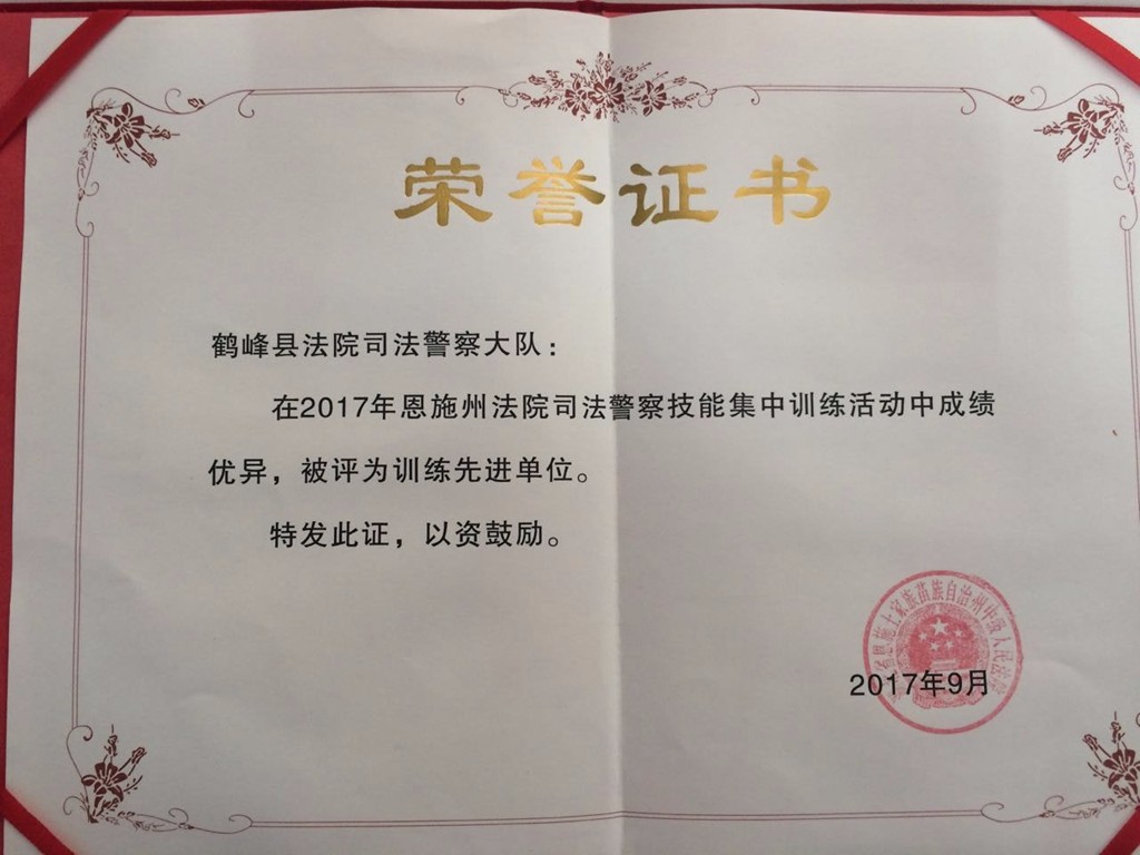 (通讯员 陈锐)近日,在恩施州中级人民法院开展的司法警察技能集中训练中,鹤峰县法院法警大队以优异的成绩被评为“训练先进单位”,张厚丰和向光辉两位同志被评为“训练先进个人”。自2015年以来,鹤峰县法院法警大队连续三年获此殊荣。
