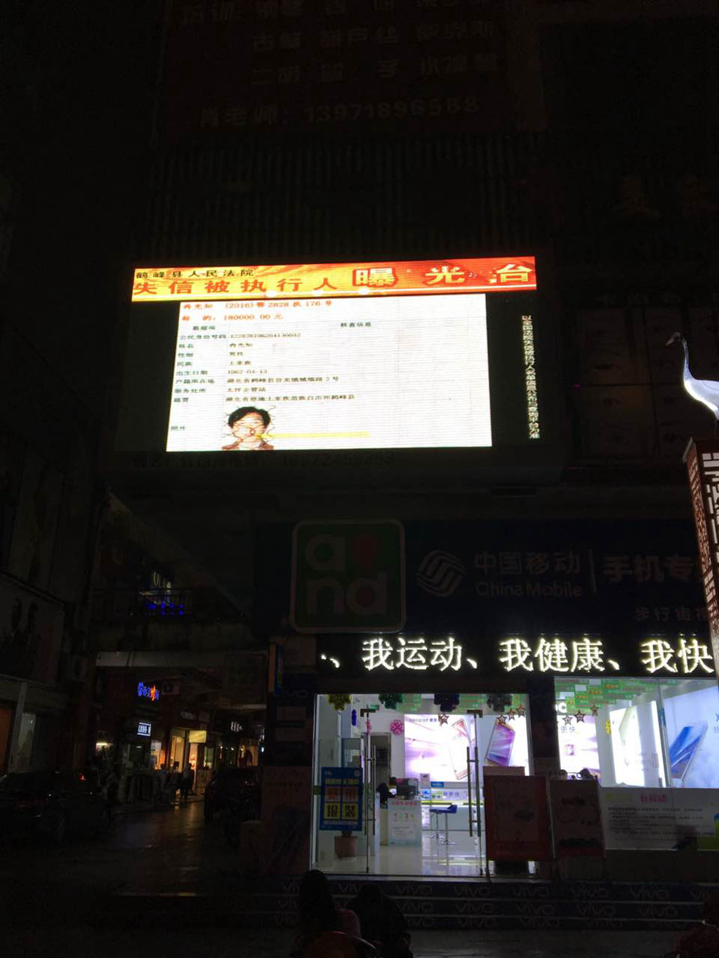 (通讯员 胡爱民)近日,鹤峰县法院紧紧围绕中共中央办公厅、国务院办公厅印发的《关于加快推进失信被执行人信用监督、警示和惩戒机制建设的意见》,按照《最高人民法院关于公布失信被执行人名单信息的若干规定》的总要求,加大了对失信被执行人的惩戒力度。我院在院内户外显示屏、县城步行街的LED显示屏及微信公众号上分别公布了失信被执行人名单,让“老赖”无处遁形。据统计,此次公布的失信被执行人共120余人,其中:户外显示屏、步行街LED显示屏对外发布了3期,微信公众号发布了7期。