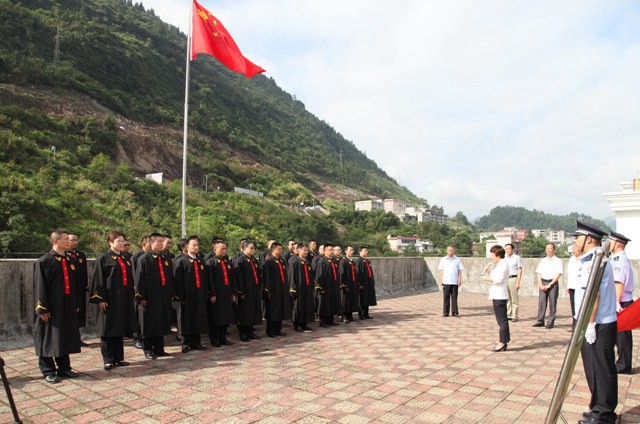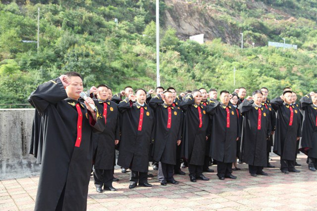 鹤峰法院网讯(通讯员 敖慧颖)“我是中华人民共和国法官,坚决拥护宪法,永远忠于法律,恪尽职守,秉公办案,清正廉洁,公正司法,为维护社会正义、捍卫法律尊严而奋斗。”8月13日上午9点,在雄壮的国歌之后,鹤峰县人民法院30名法官在院党组书记、院长舒业树的领誓下,面向国旗挺立,身着法袍,右手握拳过肩,齐声呐喊,发出自己庄严承诺。